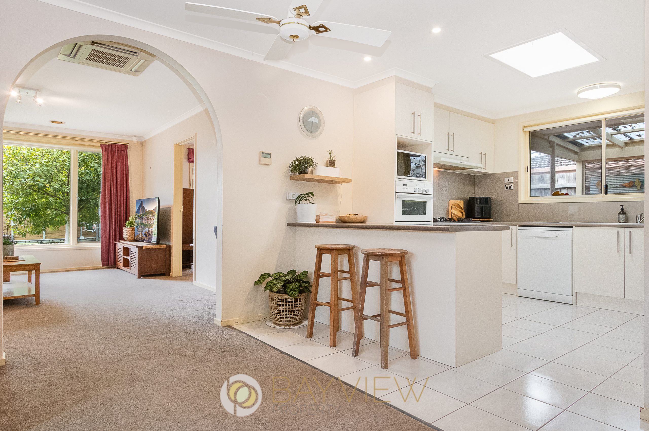The home features two living areas and a well-appointed kitchen complete with quality appliances, including a 900mm gas cooktop, dishwasher, sleek glass splashback, and abundant storage.
