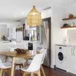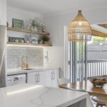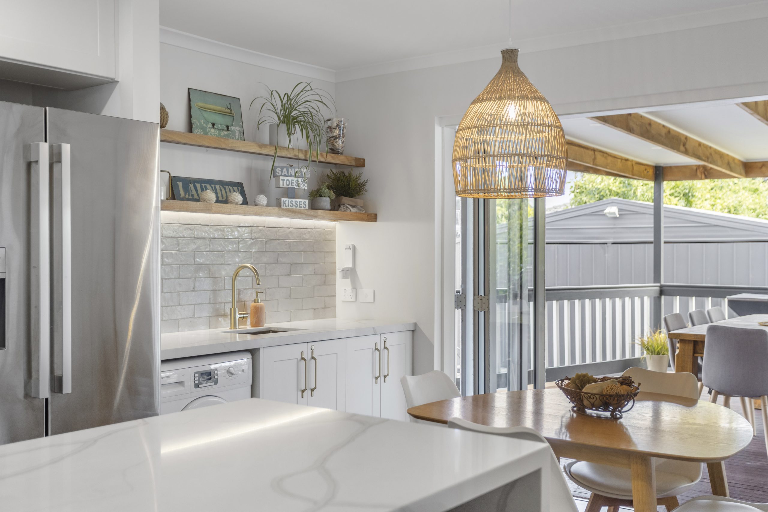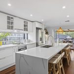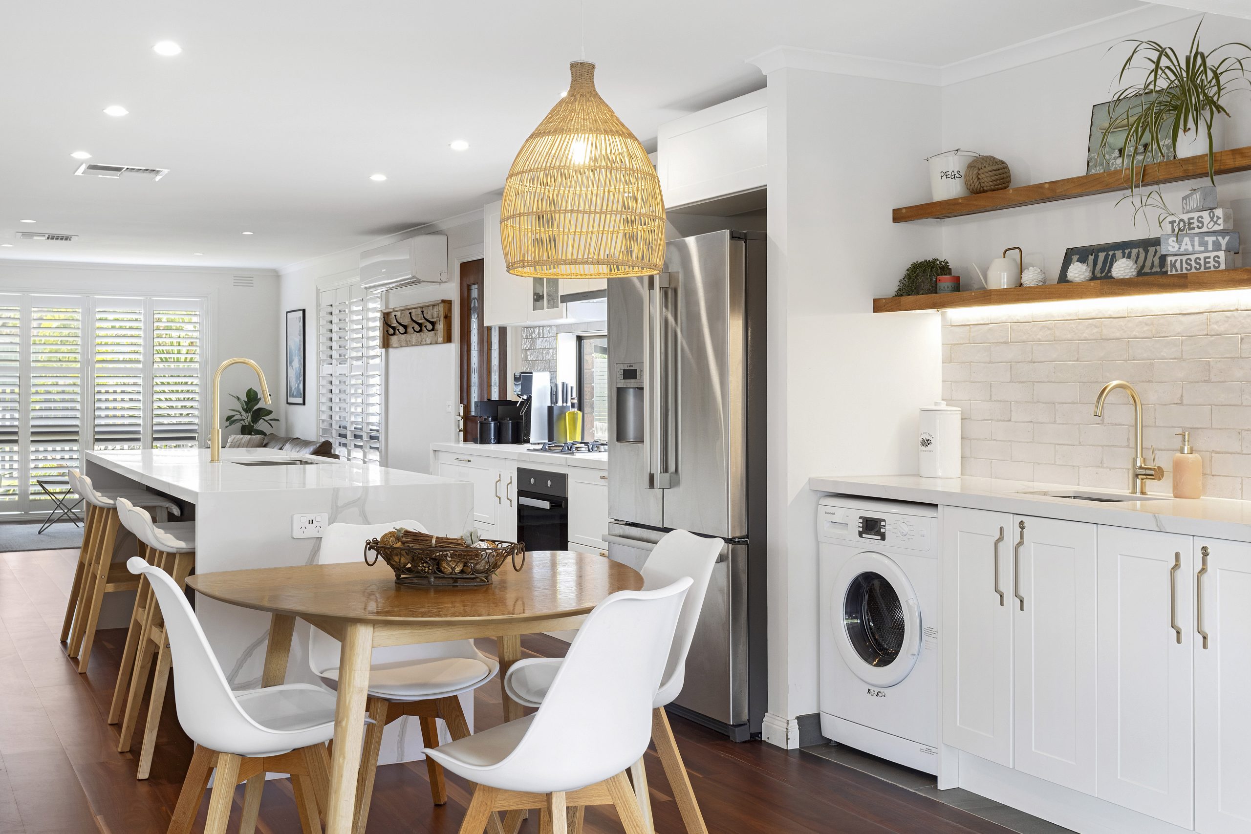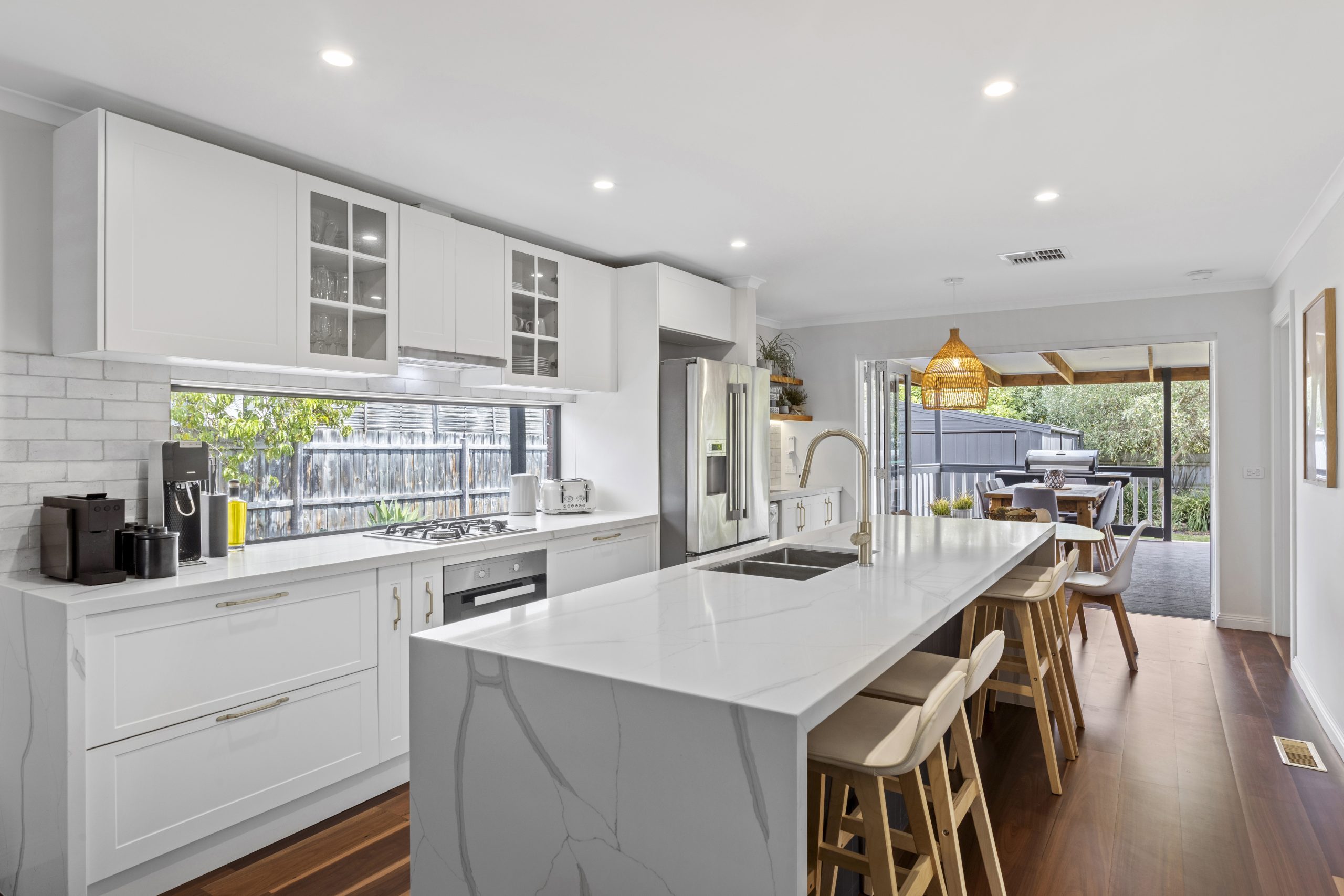 At the heart of the home is a designer kitchen, created to maximise light and space. It features elegant stone benchtops, quality modern appliances, soft-close cabinetry, and the convenience of an adjoining European laundry.