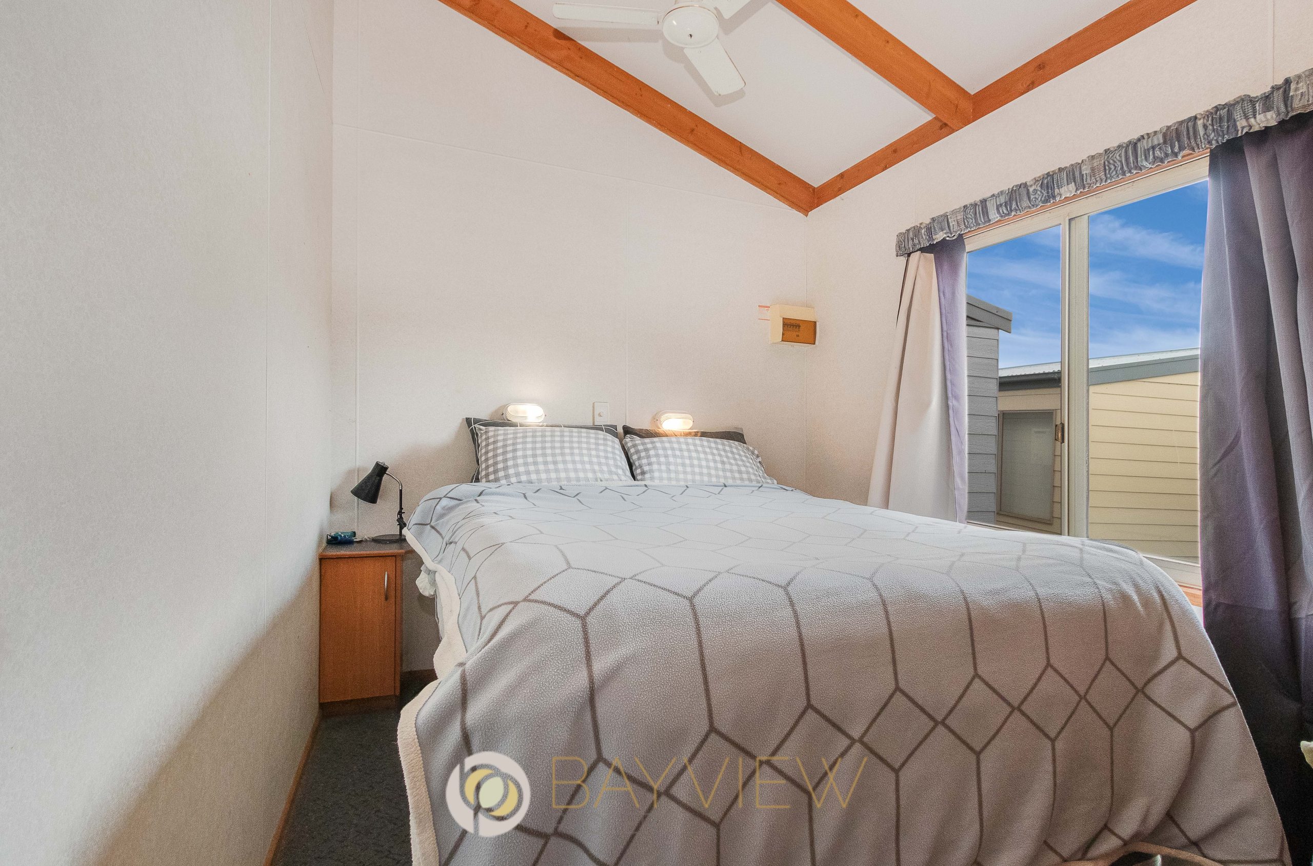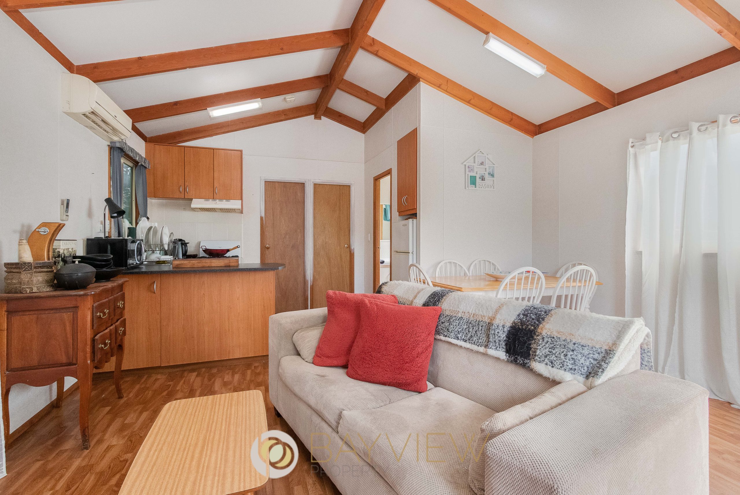 Step inside to discover a light-filled open plan living zone enhanced by raked ceilings, creating a wonderful sense of space. The functional kitchen is equipped with a freestanding gas oven and cooktop. Two comfortable bedrooms provide excellent accommodation, one with a built-in robe and the other fitted with built-in bunk beds, both serviced by a central bathroom.